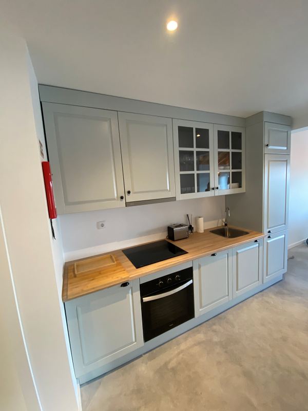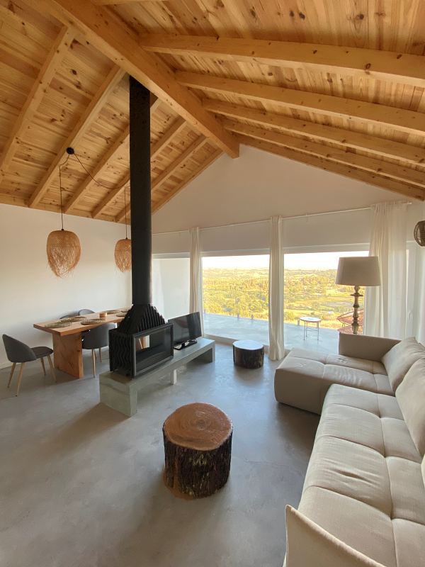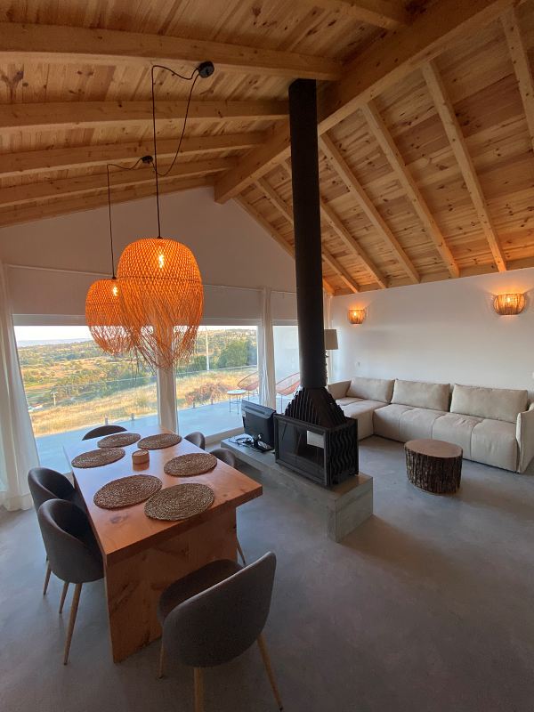 Open Space com cozinha (equipada com frigorífico, forno, placa, máquina de lavar a loiça e máquina de café Nespresso), sala de estar com lareira e sala de jantar